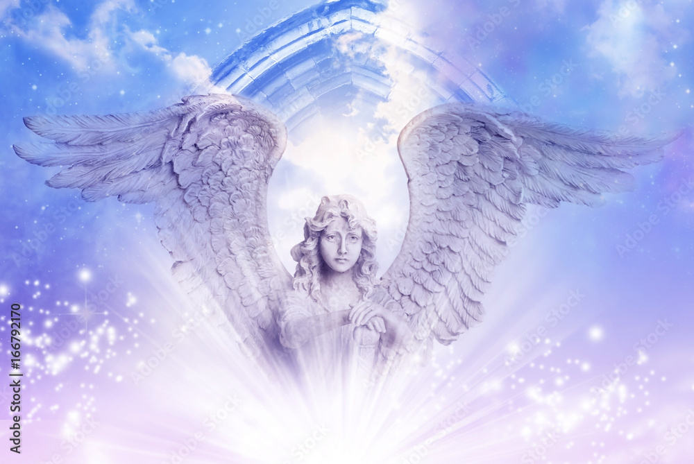 Fototapeta angel archangel with big wings over a mystical Divine sky with a gate and stars