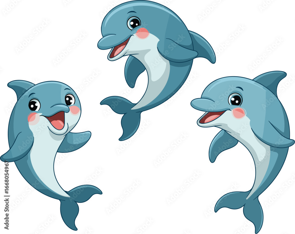 Fototapeta Cute cartoon dolphins smiling and swimming together, happy marine animals illust