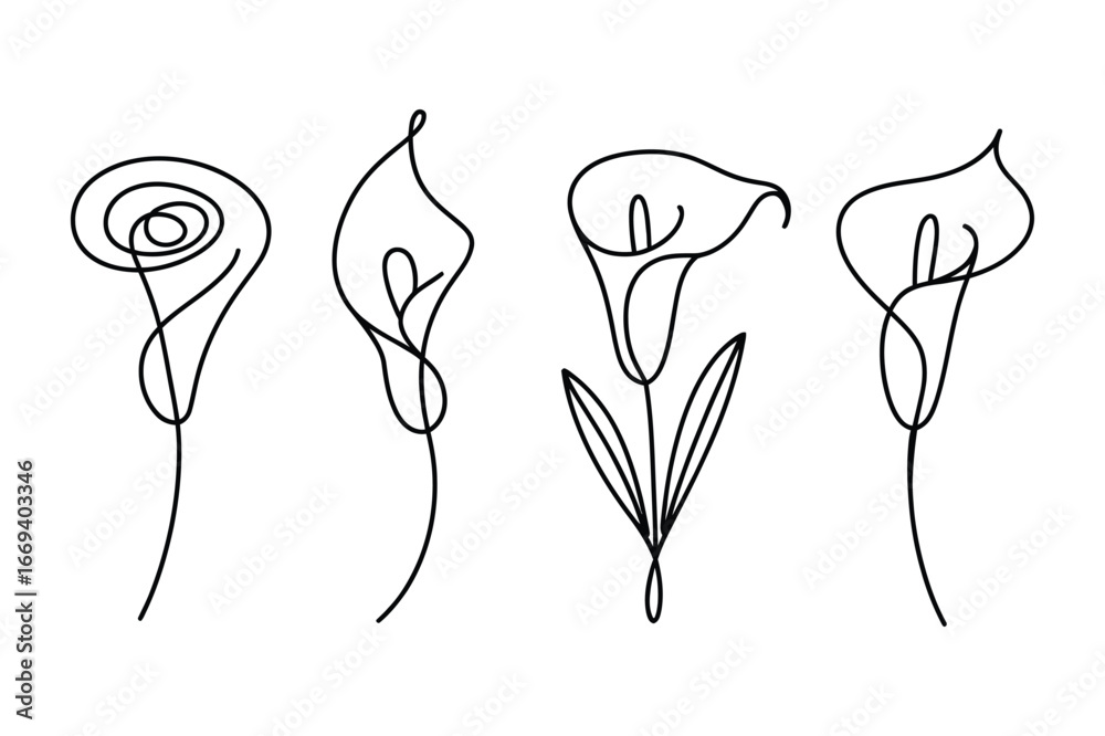 Fototapeta Elegant single line drawing of four delicate calla lilies in various stages of b