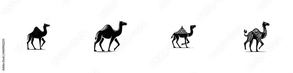Fototapeta Stylized camels in silhouette walking across a white background, minimalist mono