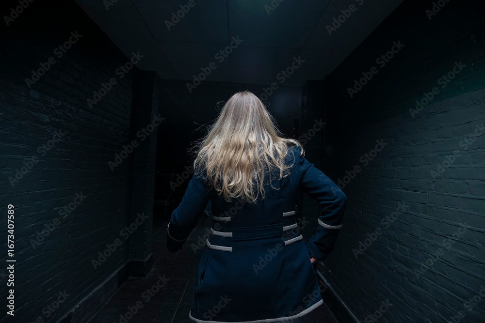 Fototapeta Blonde woman in dark underground tunnel creating dramatic atmospheric portrait l