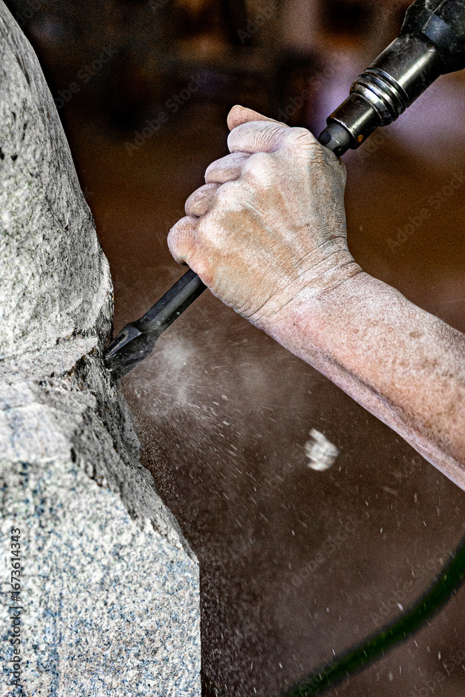 Fototapeta Female stone mason carving a sculpture with power tools