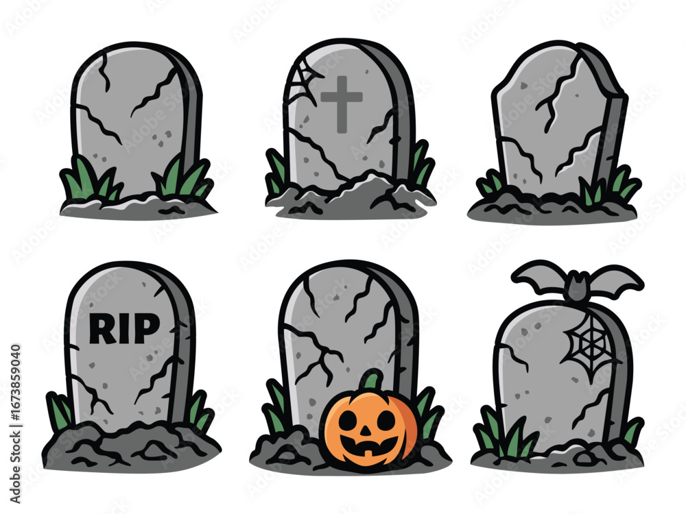 Fototapeta A cartoon illustration featuring six different grey tombstones with various designs and Halloween elements