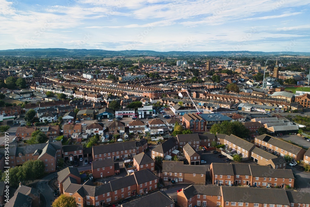 Fototapeta Aerial view of a riverside Housing Estate in Taunton, UK
