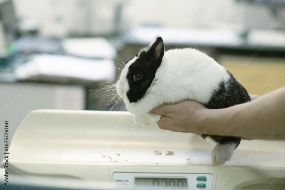 Fototapeta Rabbit weighing on a digital scale at a veterinary clinic, illustrating animal health monitoring, clinical care procedures, and welfare-focused handling practices for small mammals