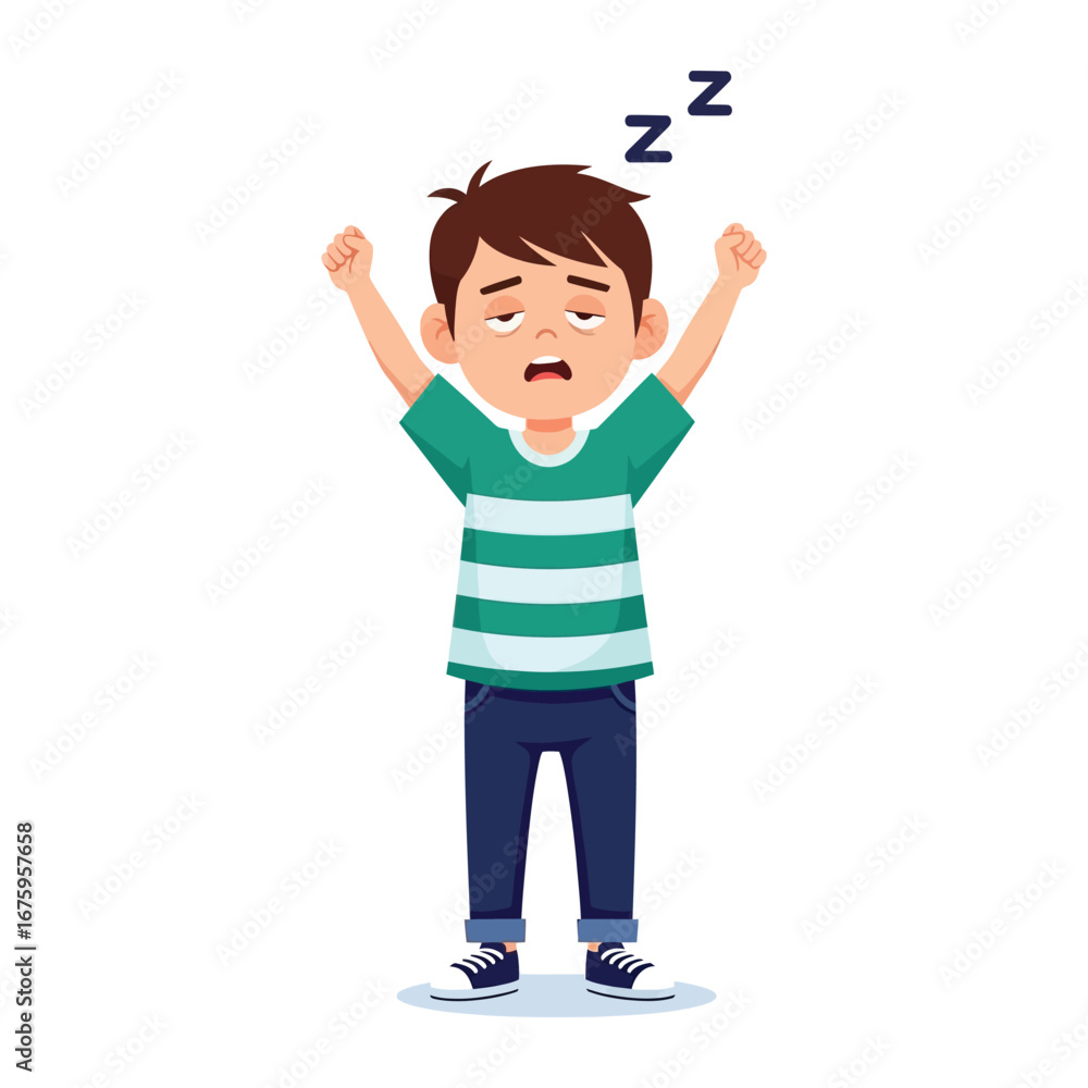 Fototapeta Tired boy waking up : An illustration of a sleepy child in a striped t-shirt and jeans is just waking up