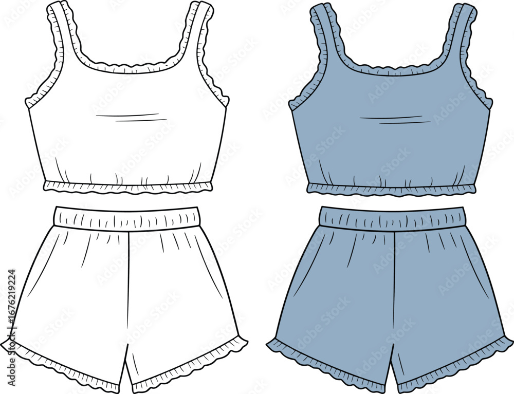 Fototapeta Women’s crop top and shorts loungewear set, ruffle trim detail, front and back t