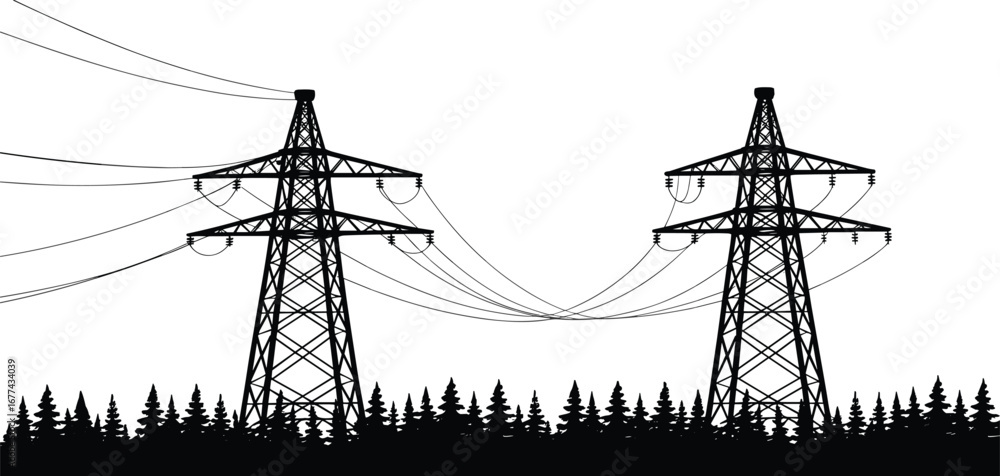 Fototapeta High voltage transmission towers, power lines over forest, electricity infrastru