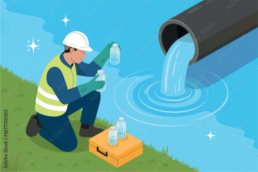Fototapeta Water quality technician collecting samples from polluted stream near industrial