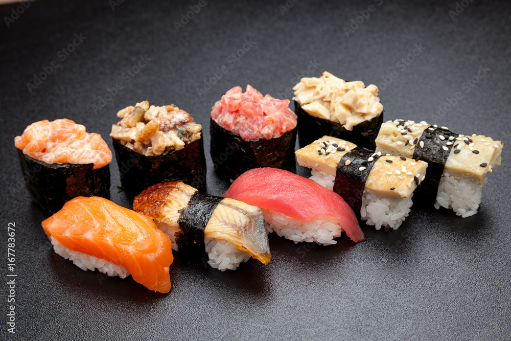 Fototapeta Many different sushi on a black table, Japanese food