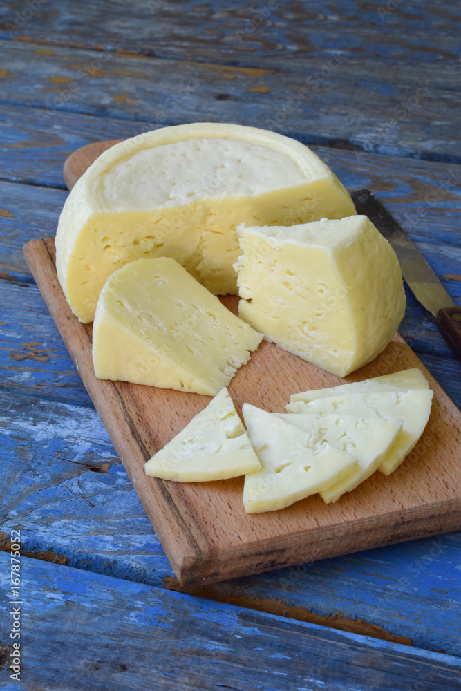 Fototapeta young homemade cheese on a blue wooden background