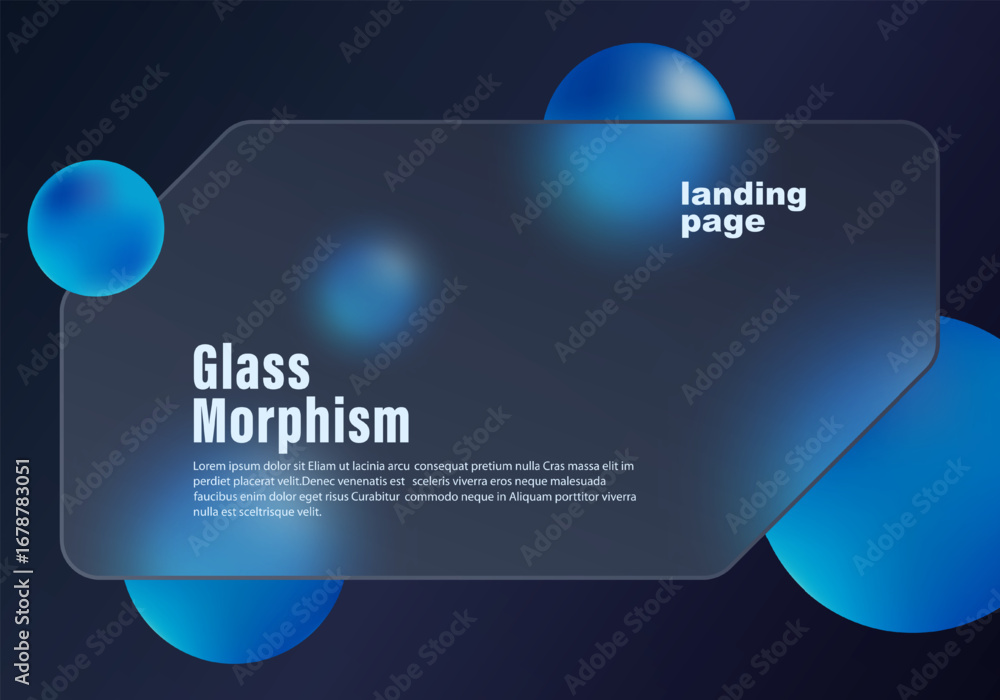 Fototapeta Futuristic glasmorphism landing page template with frosted glass panel and glowing blue 3D spheres on dark gradient background