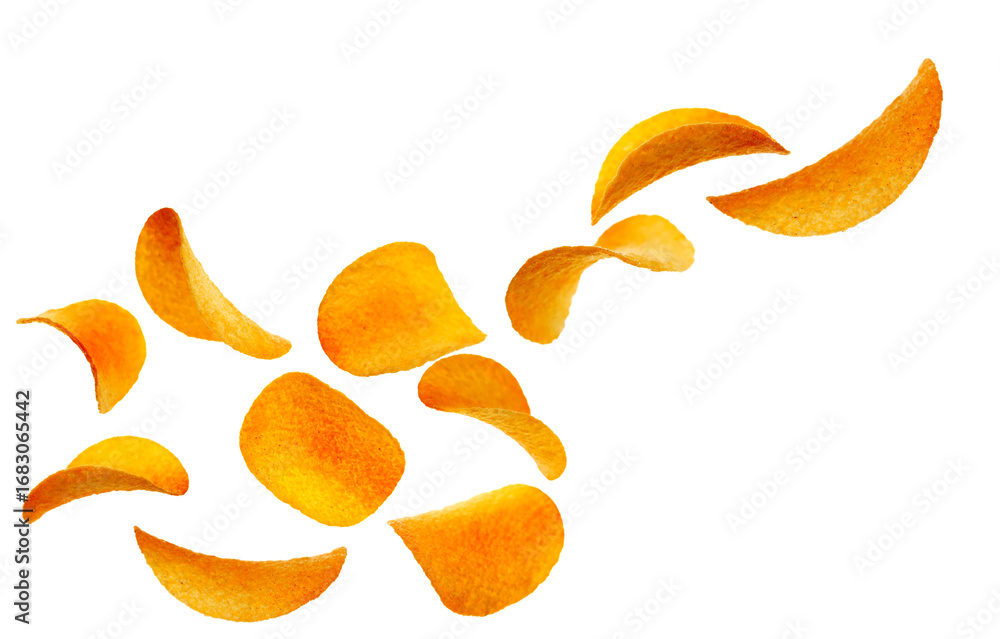 Fototapeta Set potato chips with paprika flavor falling, isolated on white background, clos