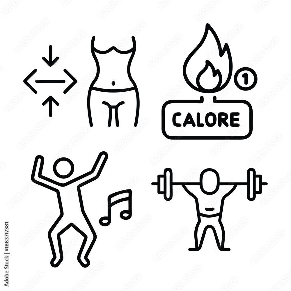 Fototapeta Four simple line art icons depict body shape changes, calorie burning, dancing, and weightlifting, symbolizing fitness and health