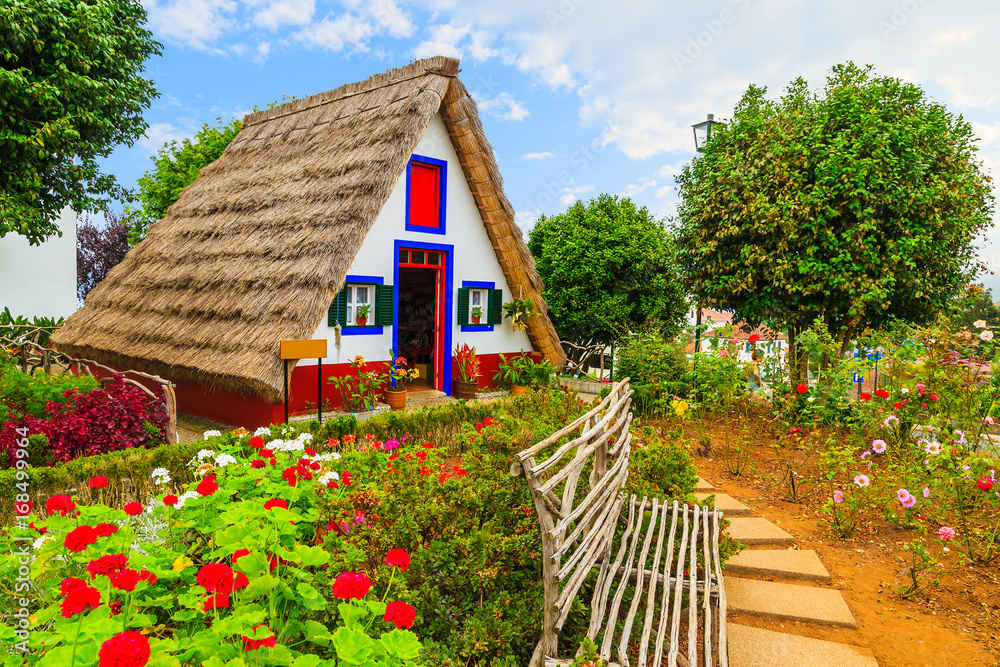 Fototapeta Traditional rural house with straw roof in Santana village, Madeira island, Port