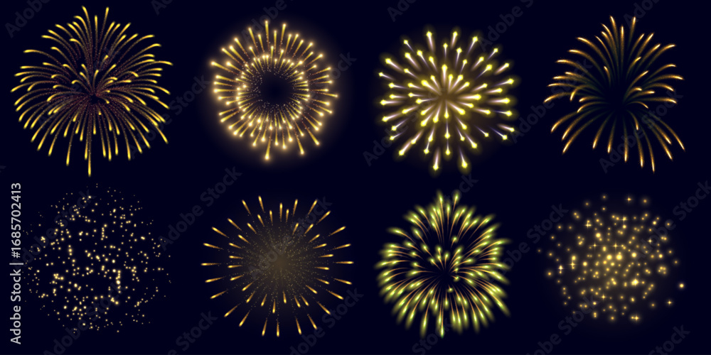 Fototapeta Set of festive golden fireworks with glowing sparks and splashes, different shapes