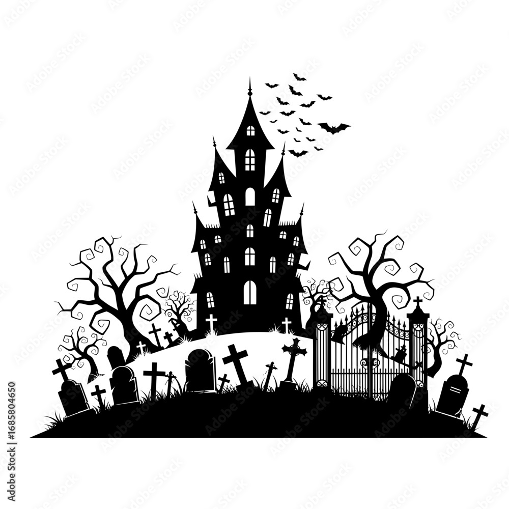 Fototapeta Vector art of eerie haunted house with graveyard and bats, silhouette for hallow
