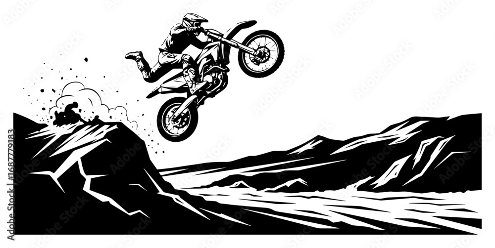 Fototapeta Motocross rider jumping over rocky mountain landscape