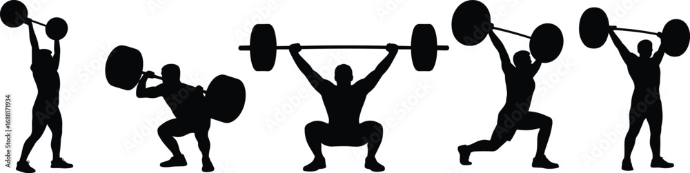 Fototapeta Silhouettes of weightlifters performing squats, clean and jerk, and overhead lif