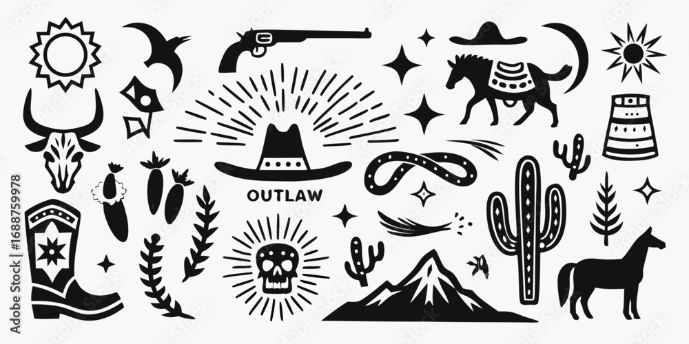 Fototapeta Wild west cowboy outlaw collection of icons with skull horse cactus and boots