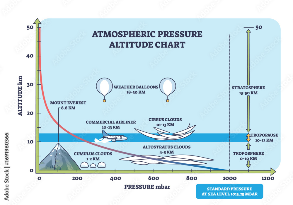 Fototapeta Atmospheric pressure altitude chart shows how pressure decreases with altitude, featuring clouds, a mountain, and weather balloons