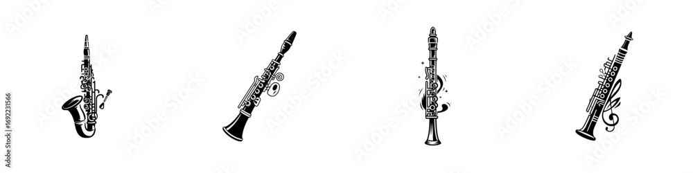 Fototapeta Collection of black clarinet silhouettes, woodwind musical instrument icons for