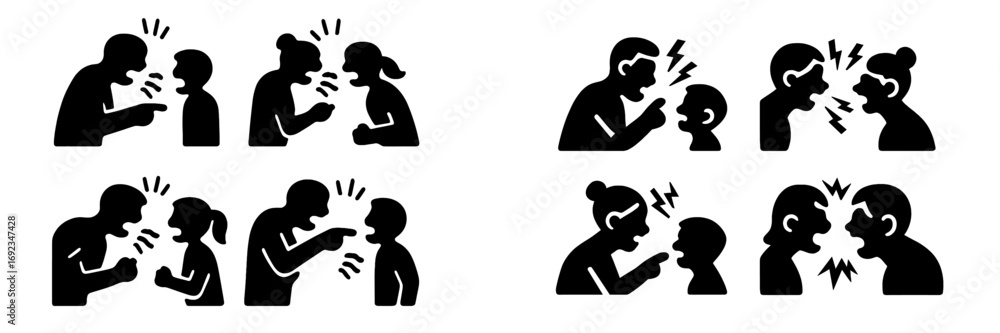 Fototapeta A set of black silhouette icons depicting family conflict, domestic abuse, paren