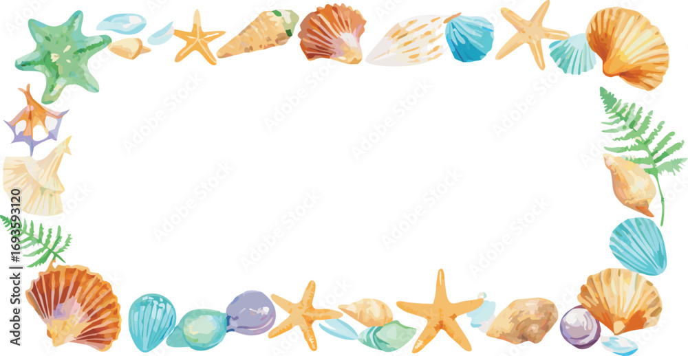 Fototapeta A vector design showcasing a border of watercolor sea shells in gentle hues, perfect for coastal-themed projects