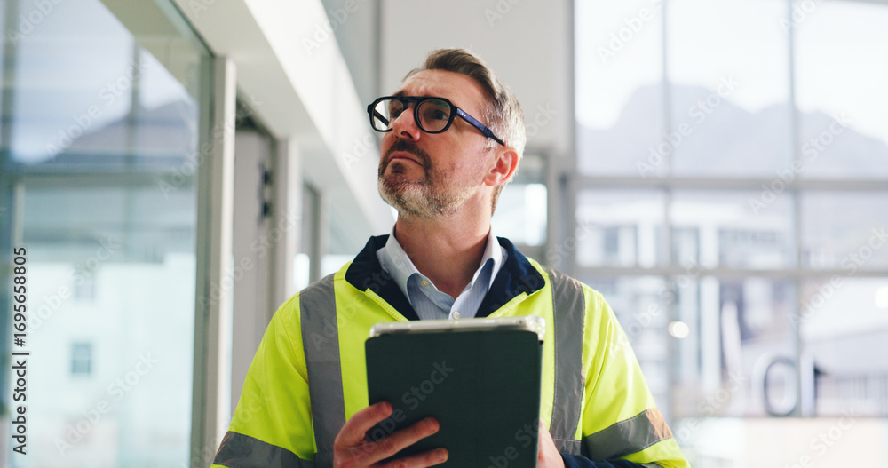 Fototapeta Thinking, architecture and man with tablet, inspection and app for checklist, real estate or ideas