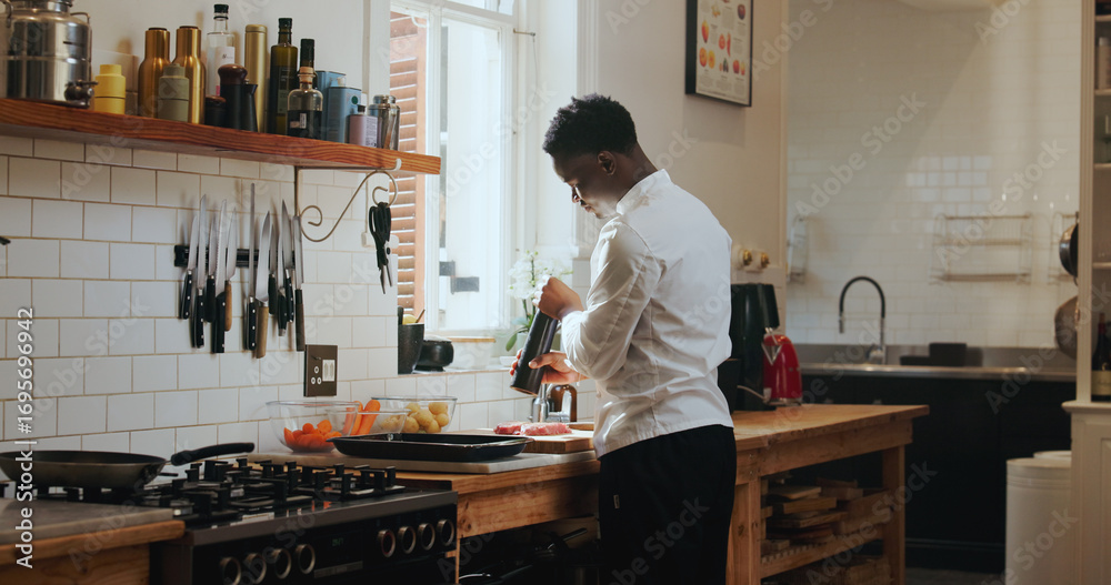 Fototapeta Cooking, spice and steak with black man in kitchen of home for meal preparation or recipe