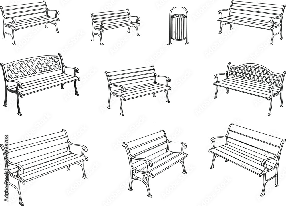 Fototapeta Black and white sketches of various outdoor benches with different designs and a
