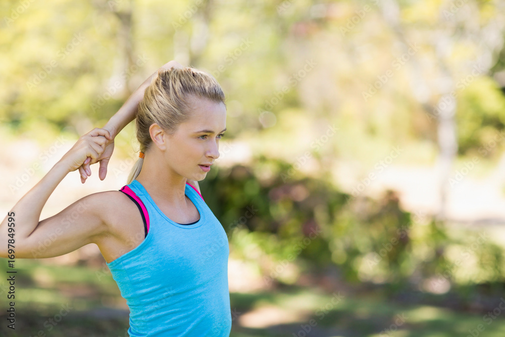 Fototapeta Fit woman wearing bright blue athletic tank top pulling elbow while stretching s