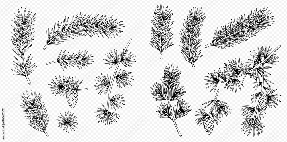 Fototapeta Hand-drawn collection of various coniferous tree branches and pine cones in black and white line art style
