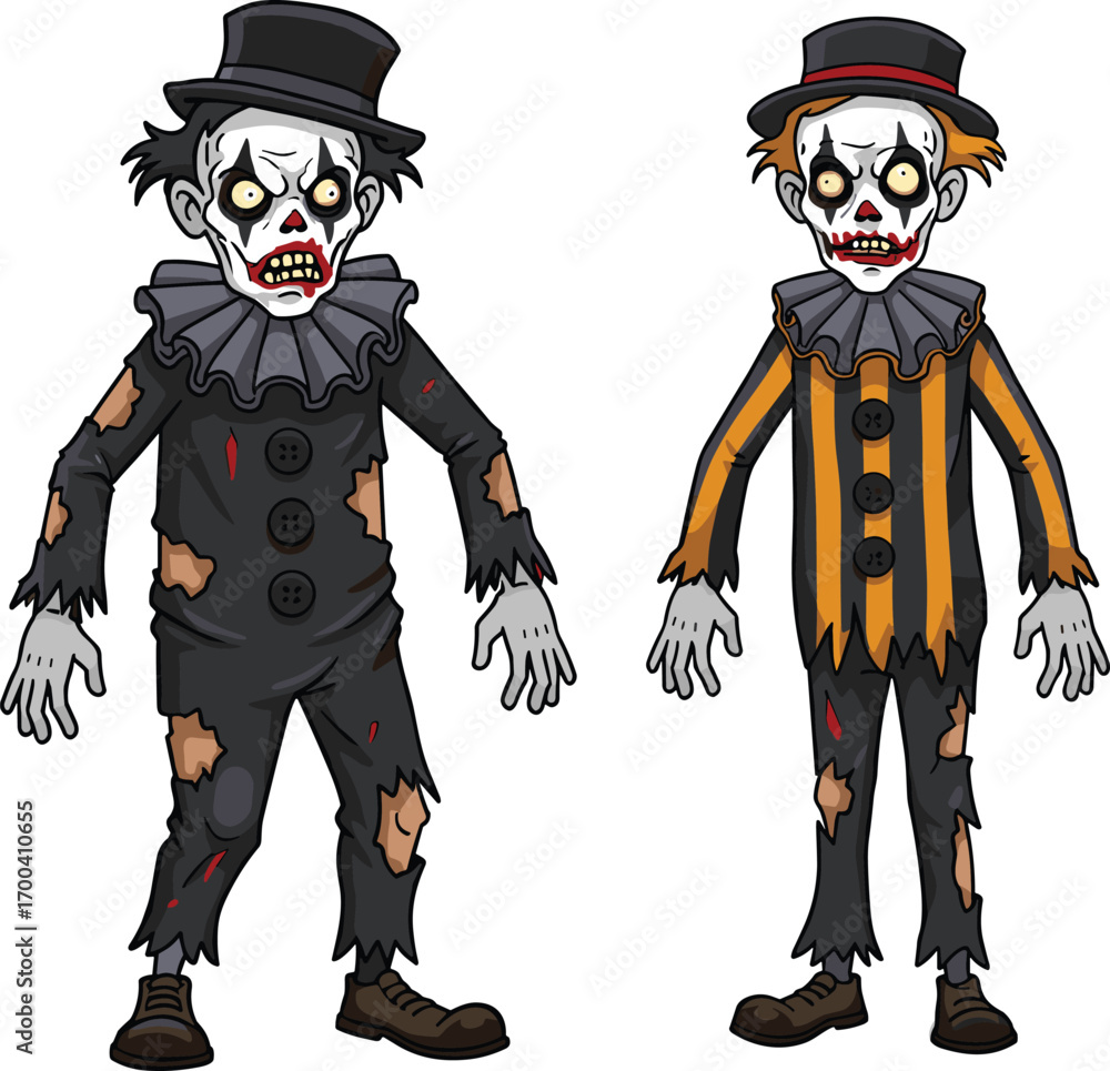 Fototapeta Two scary zombie clowns in torn costumes with creepy face paint, undead carnival