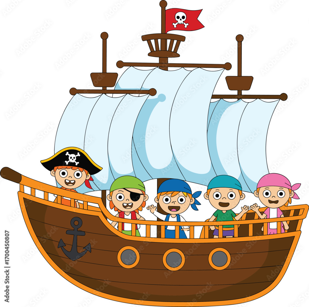 Fototapeta Cartoon pirate ship with happy kids dressed as pirates, sailing adventure illust