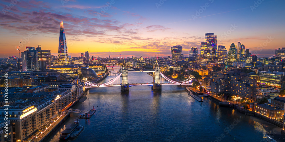 Fototapeta London City Skyline with Tower Bridge Illuminated at Sunset Aerial Panorama, Eng