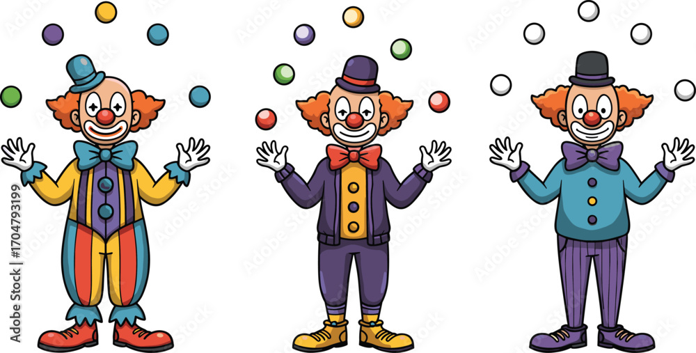 Fototapeta Colorful cartoon clowns juggling balls in circus performance, wearing vibrant co