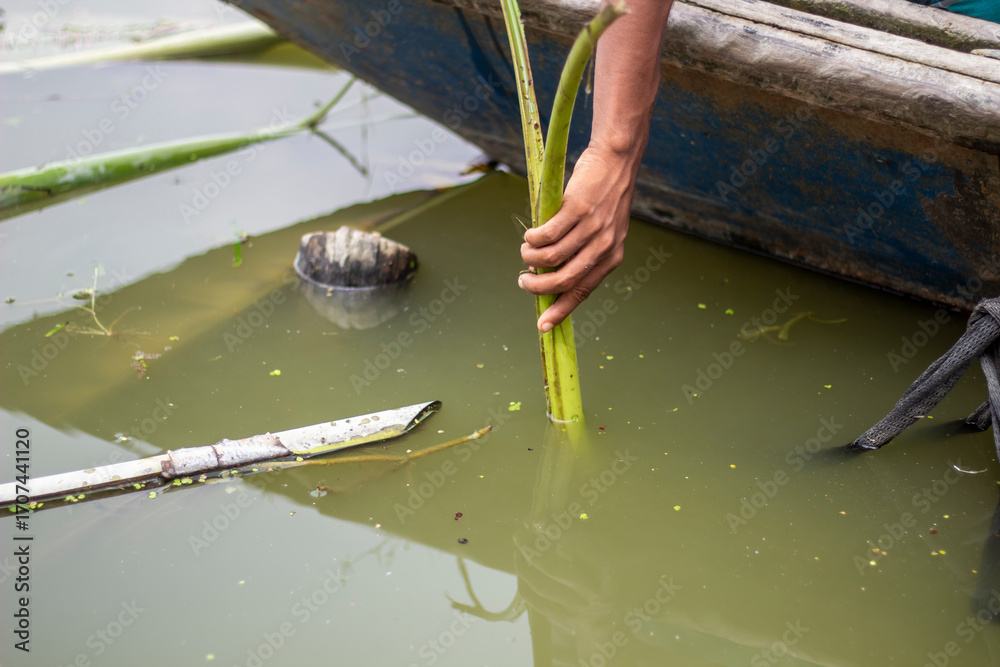 Fototapeta A persons hand pulls a green plant from murky water near a boat