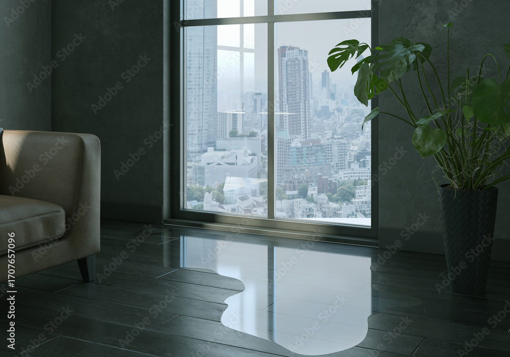 Fototapeta Water leaking and flooded on black wood parquet floor.
