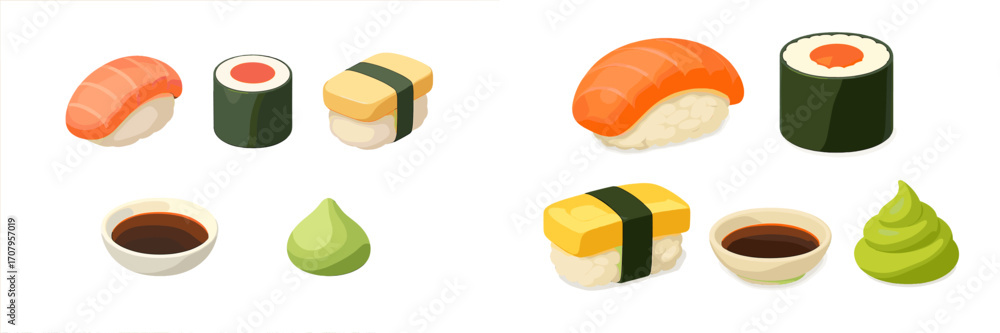 Fototapeta Delicious Japanese sushi set with various rolls and nigiri, including salmon and