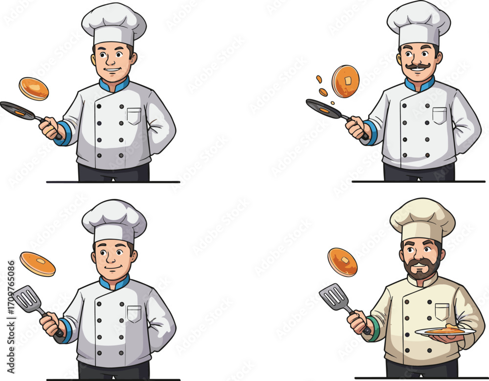 Fototapeta Flipping pancakes chef in purple, black, blue, and brown uniforms, cartoon culin