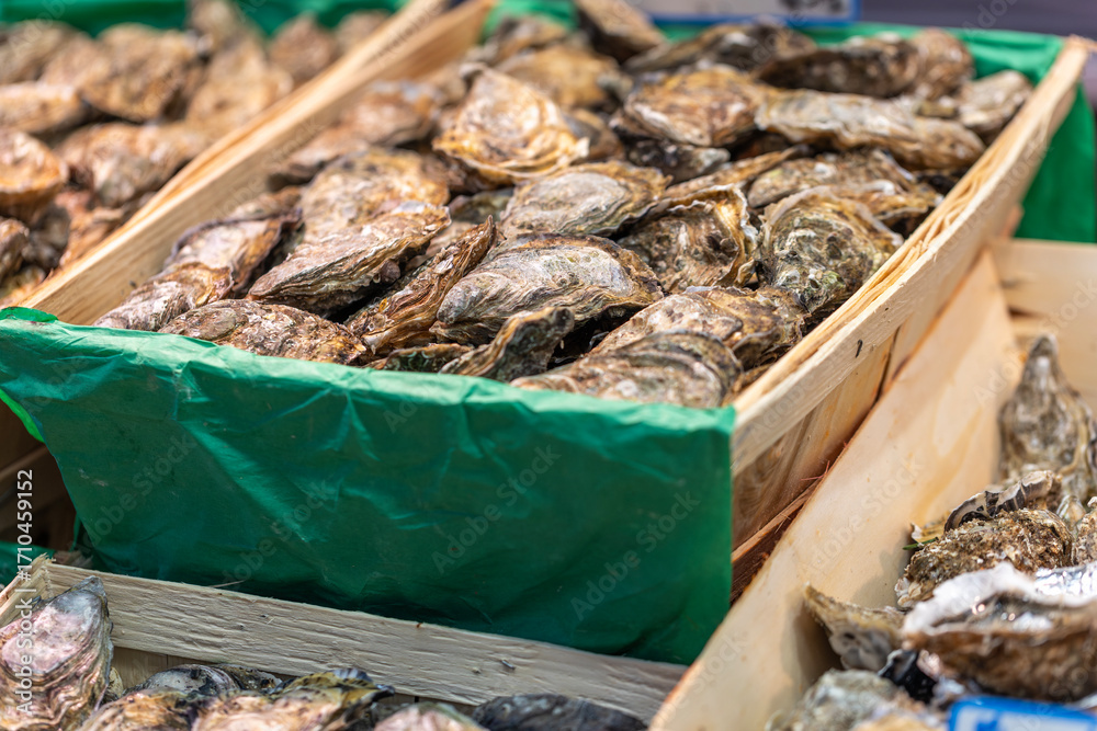 Fototapeta Fresh oysters with a rough, layered texture are for sale in a wooden crate at a street seafood market in Paris, France