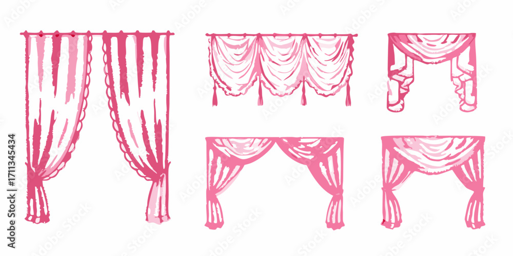 Fototapeta Collection of hand drawn pink draped curtains and valances in various styles