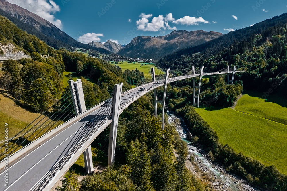 Fototapeta Die ikonische Sunnibergbrücke der Umfahrung Klosters (GR), die über den Fluss La