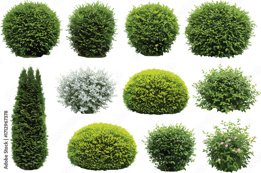 Fototapeta PrintSet of green bushes, garden shrubs, trimmed hedges, topiary plants, realist