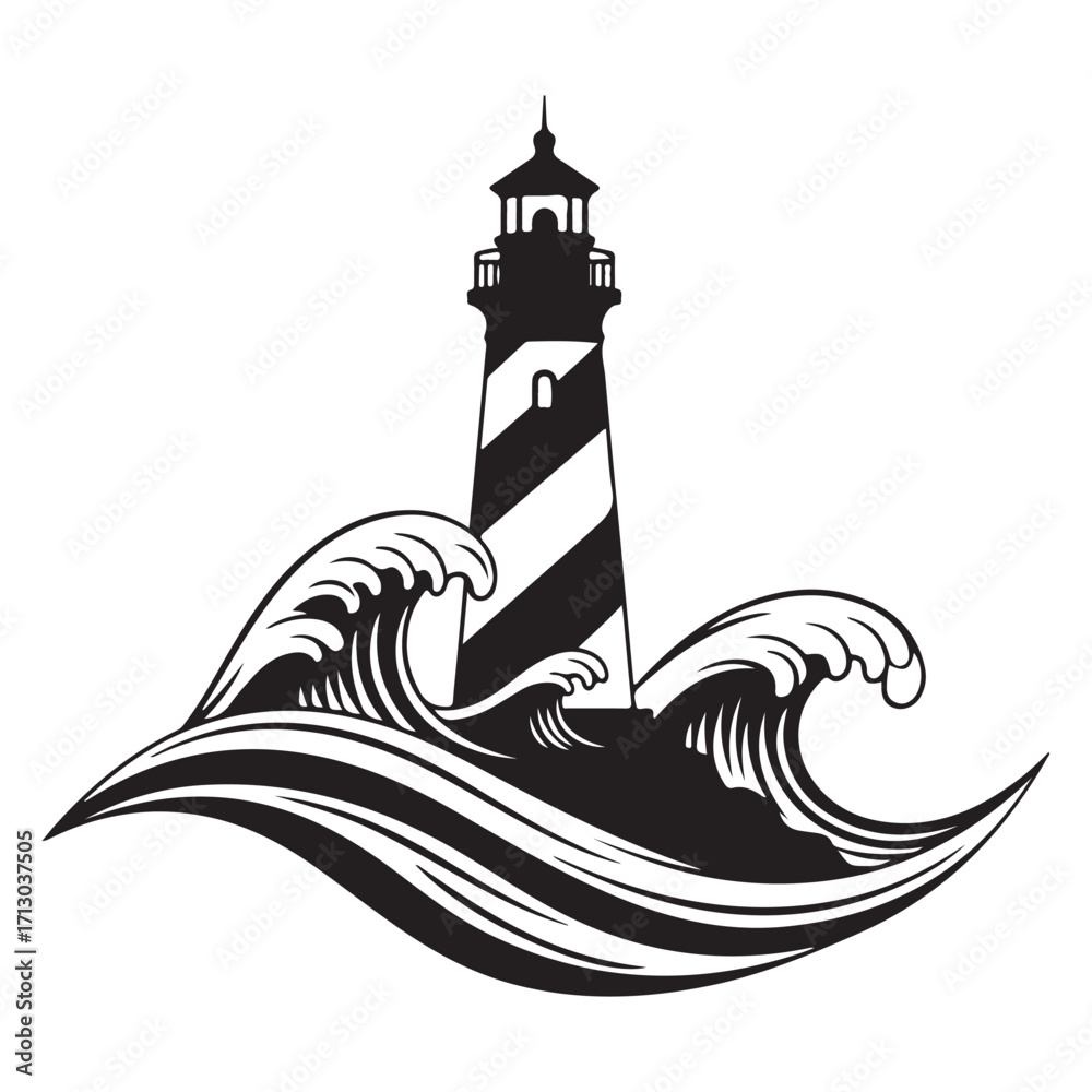 Fototapeta Black and White Lighthouse Amidst Stylized Ocean Waves Illustration
