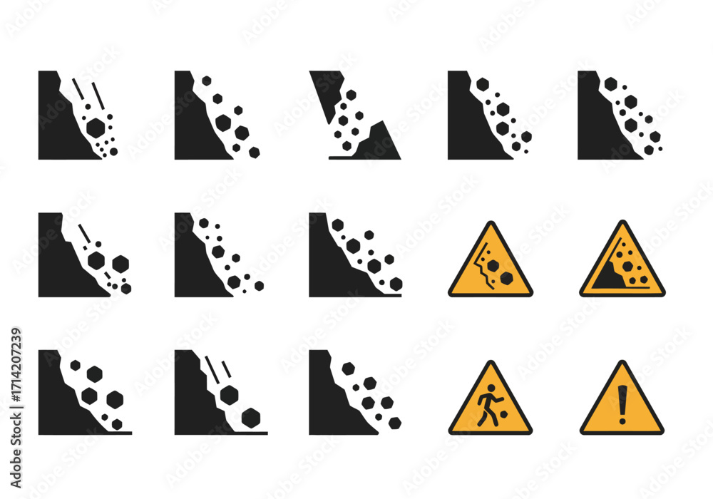 Fototapeta Display of fifteen avalanchefalling rocks warning symbol variations in blackyell
