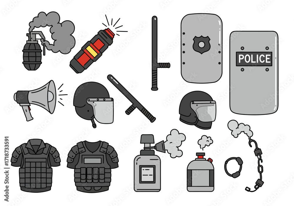 Fototapeta Police riot gear shields helmets batons vests tear gas grenades
