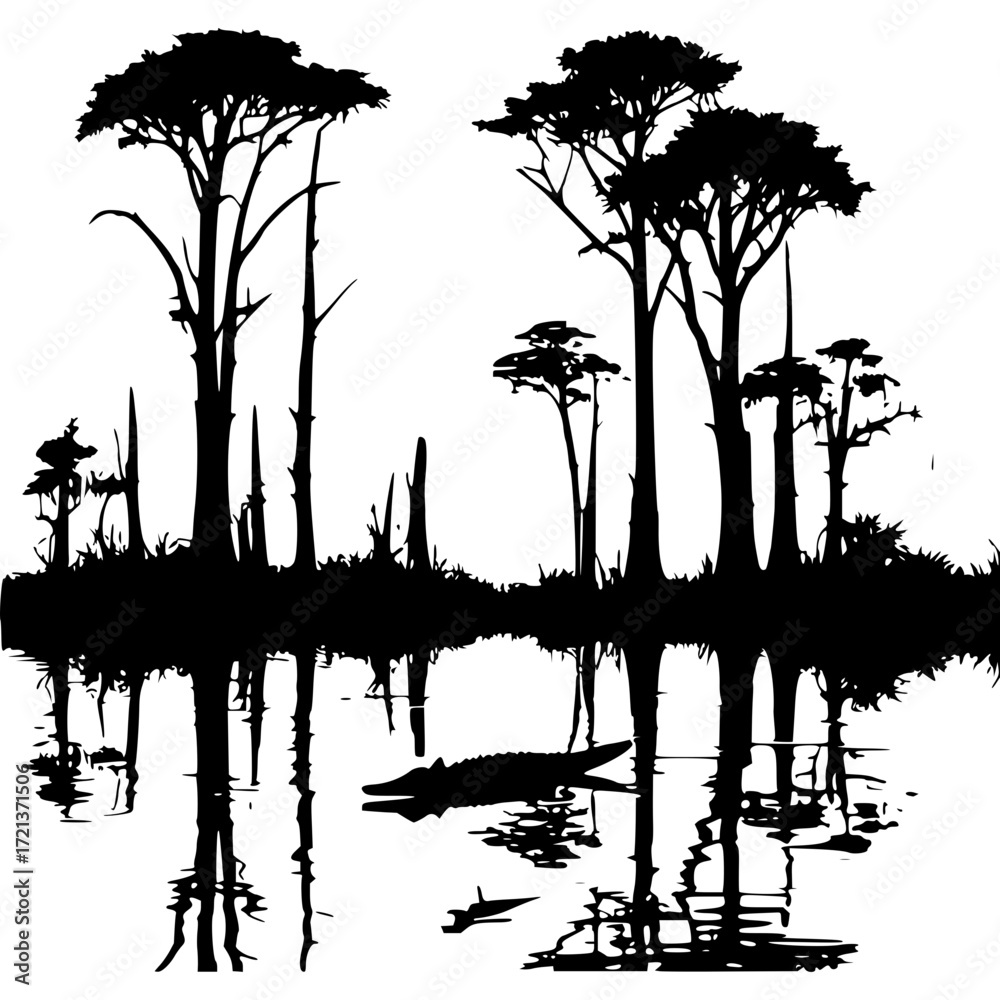 Fototapeta Explore the swamp landscape with alligator silhouette and tree reflection