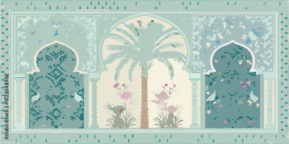 Fototapeta Ornate moroccan archway with a palm tree and floral motifs in pastel colors